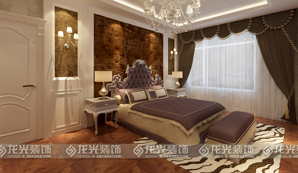 6、主臥室吊頂采用網(wǎng)格式吊頂,體現(xiàn)了歐式元素,使比較大的棚面變得更加精致,細(xì)膩,床頭背景是用護(hù)墻板,壁紙和軟包材質(zhì)相結(jié)合,使得背景墻做出來更加顯得大氣美觀,臥室地面采用實(shí)木拼花地板,體現(xiàn)年輕業(yè)主富有年輕張揚(yáng)的性格,更加體現(xiàn)了奢華的裝修風(fēng)格。