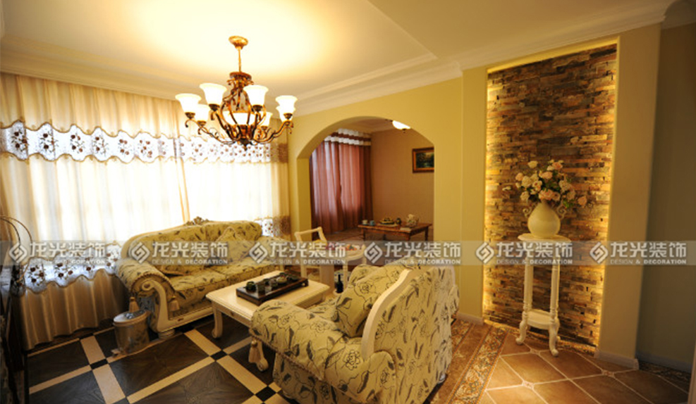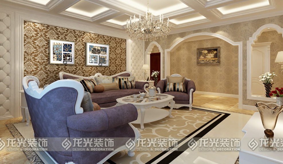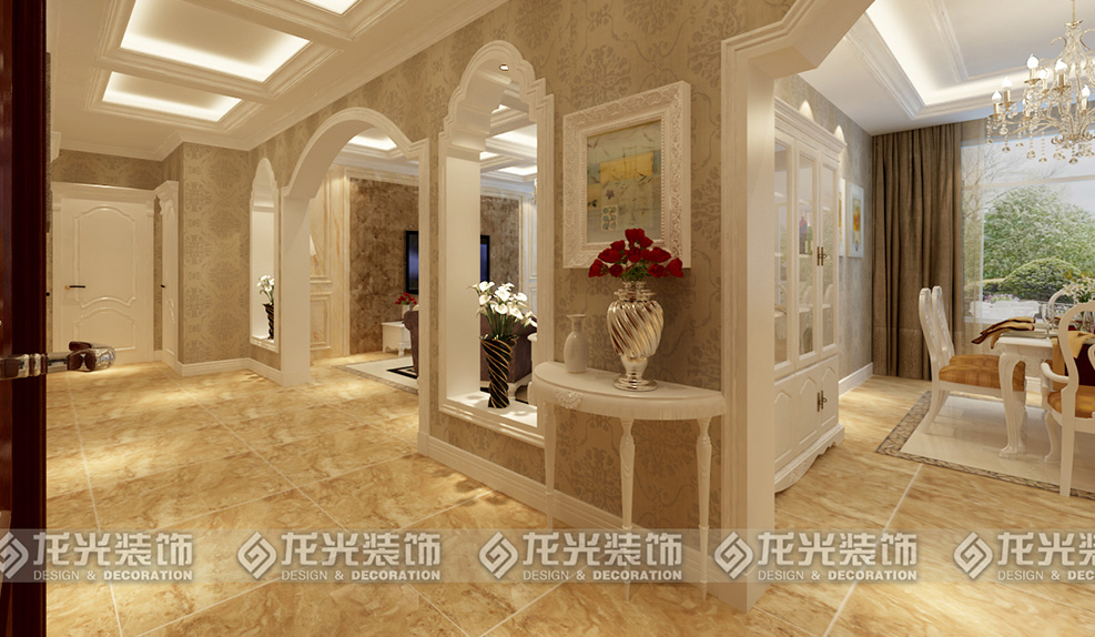 1、門廳過廊區(qū)域采用米黃色大理石瓷磚進(jìn)行鋪貼,過廊頂部運(yùn)用多個回字形懸浮吊頂,充分的將歐式風(fēng)格的高端大氣的感覺展現(xiàn)出來,造型頂既增加了過廊的延伸感,又使整個區(qū)域的頂?shù)卦煨陀辛撕芎玫暮魬?yīng),由于客廳跨度比較寬,采用三個拱形埡口造型,使得空間更有層次,兩側(cè)的埡口可以以屏風(fēng)隔斷的形式存在,劃分出客廳與過廊之間的區(qū)域。