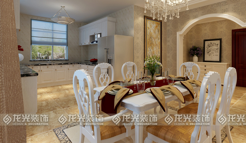 2、餐廳區(qū)域的左側(cè)為白色歐式酒柜,對面配以油墨畫的設(shè)計彰顯出主人的浪漫的情調(diào),地面采用深淺地磚顏色搭配巧妙的做出了餐廳區(qū)域劃分。在這個區(qū)域里的櫥柜.酒柜.餐桌的顏色都是采用象牙白色,以體現(xiàn)歐式風(fēng)格的簡潔大方。